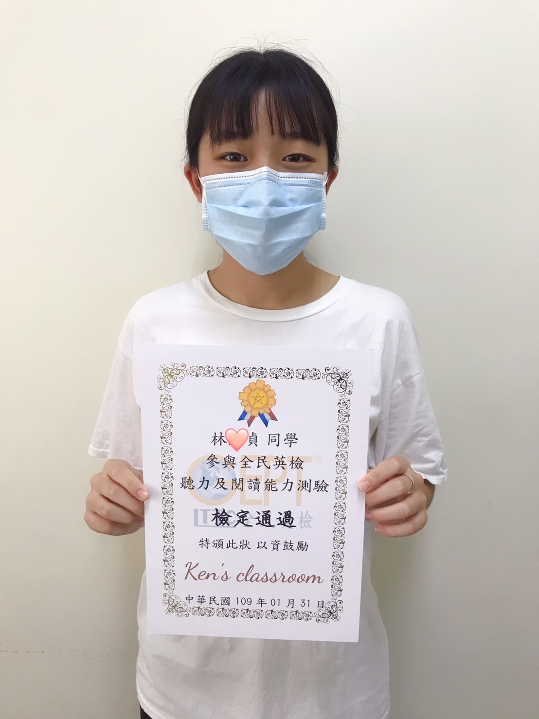 考英檢這段期間老師們都很用心,不只英文老師利用上課時間幫我檢討了當周寫完的所有題本,其他老師還會排好每周題本練習進度督促我練習,而每次模擬考完後都算一次分數,這給了我很大的信心,還記得當初考英檢是在去年的一月五日,正好在跨年後那週,莊老師在大家開開心心準備跨年時還待在補習班幫我解答英檢問題,從上午一直陪我寫題本到晚上9點左右,只要我有任何問題都會在第一時間幫我解題,最後不但通過英檢考試,也因為英檢加分讓我順利錄取想讀的學校,很謝謝所有老師的用心!